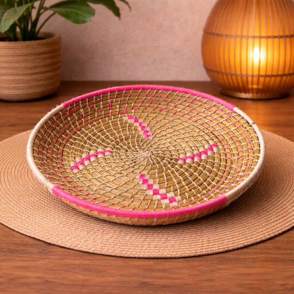 Ce plateau berbère artisanal est entièrement tressé à la main au Maroc, selon un savoir-faire traditionnel transmis de génération en génération.